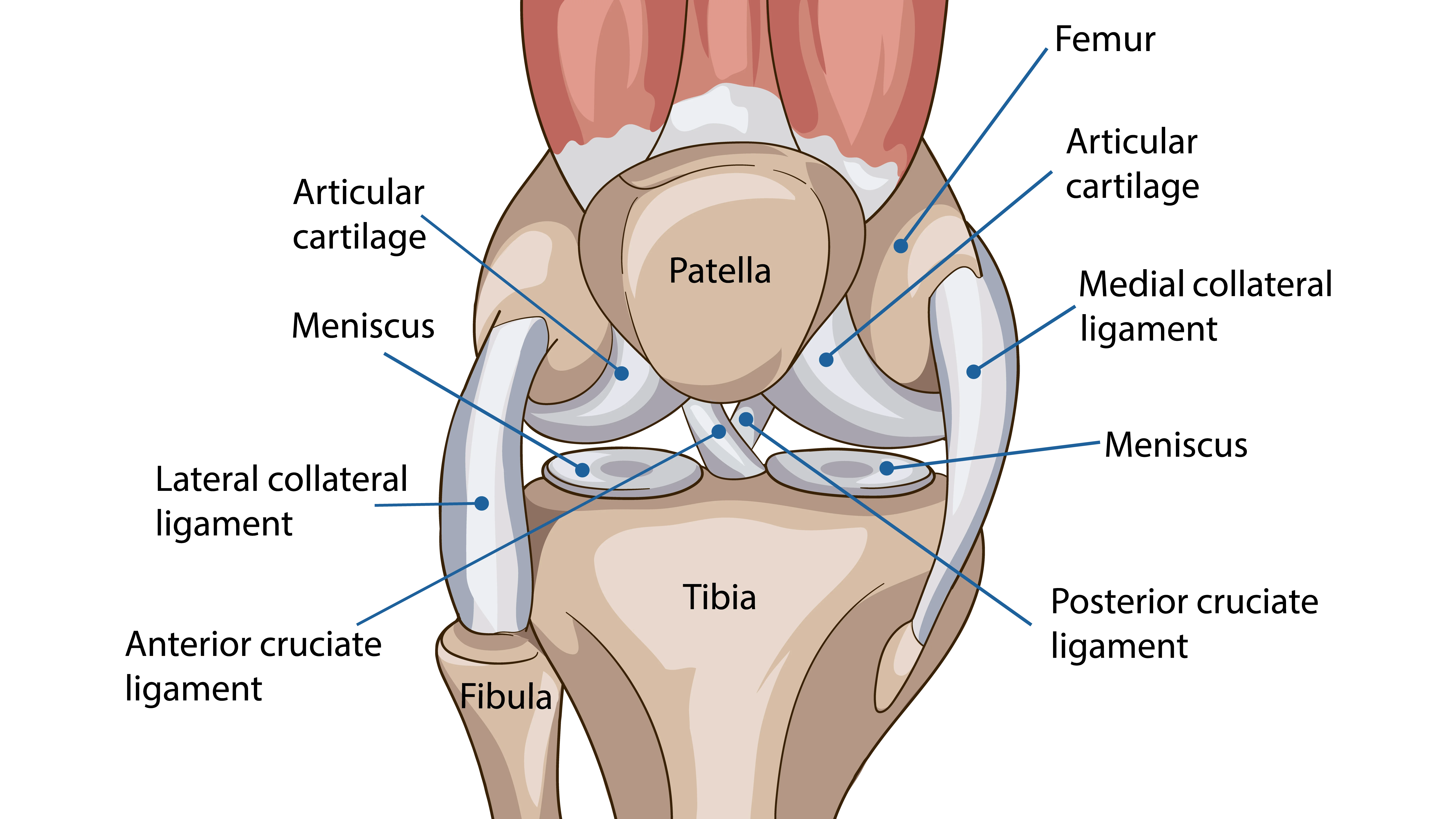 - Ligaments: Provide stability by connecting bones to bones. The four key ligaments are the anterior cruciate ligament (ACL), the posterior cruciate ligament (PCL), the medial collateral ligament (MCL), and the lateral collateral ligament (LCL).